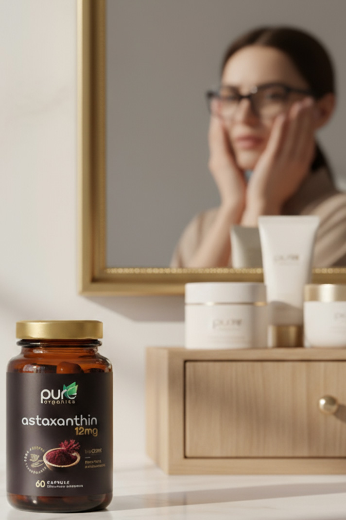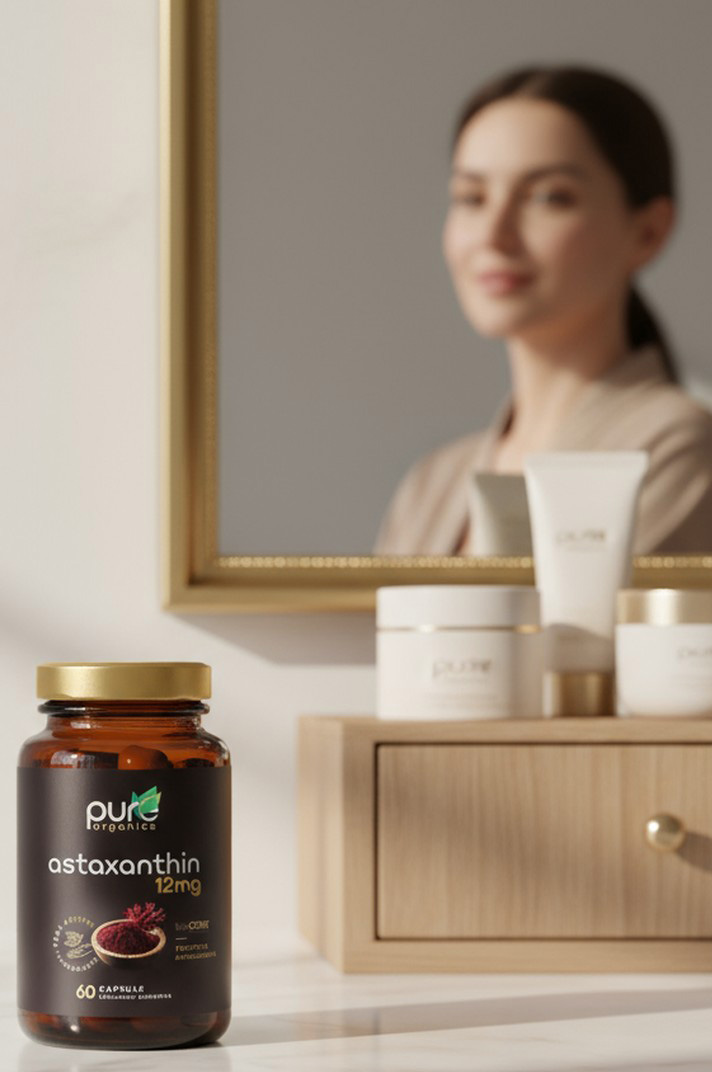 De ce PureOrganics? Folosim astaxantină naturală (nu sintetică), standardizată pentru puritate și stabilitate, complexată cu fosfolipide (BioCORE™) pentru absorbție superioară și protecție celulară eficientă.