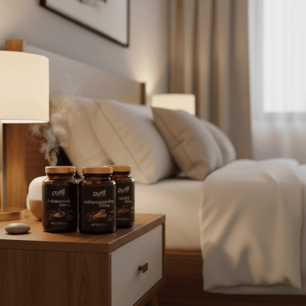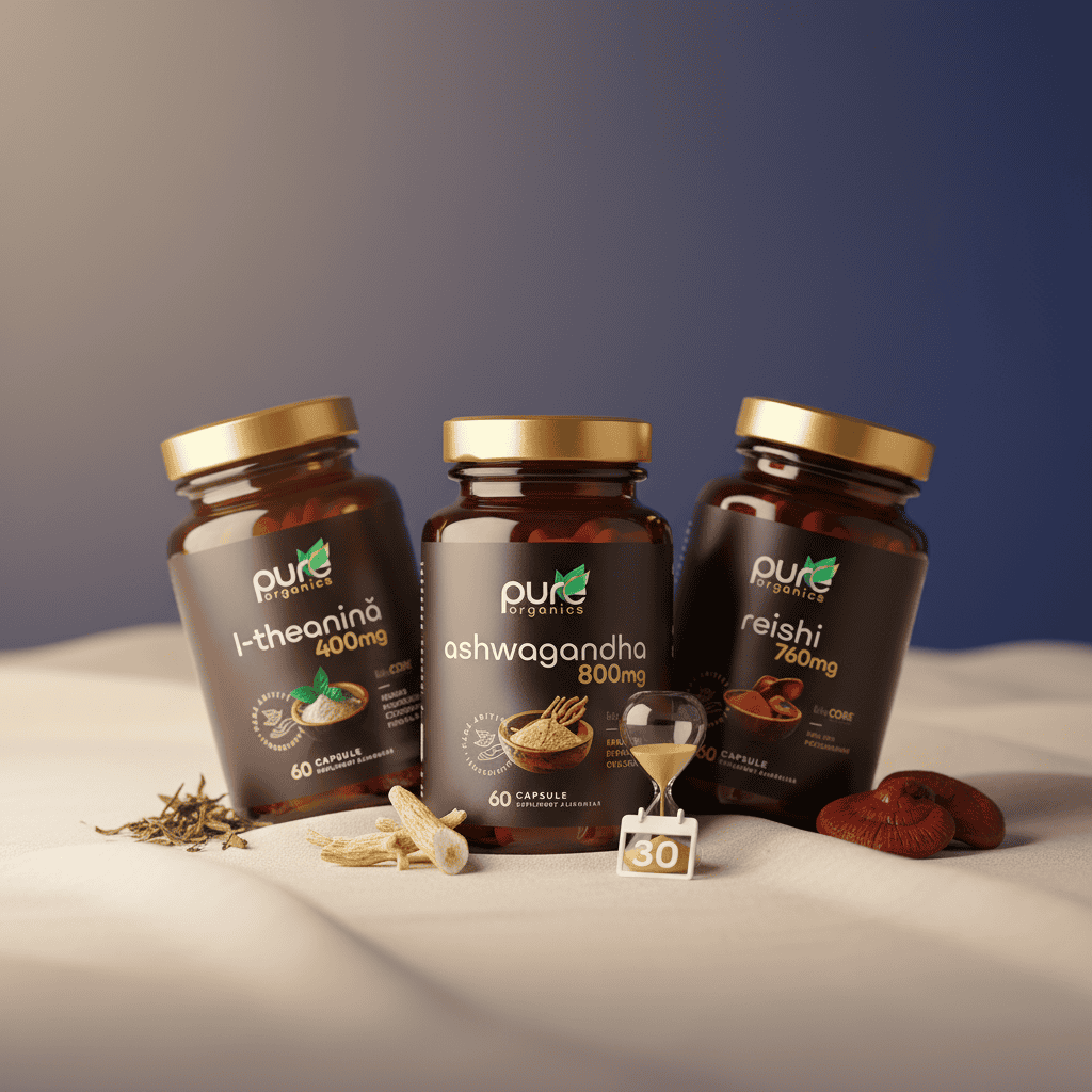 Sinergia: Ashwagandha reduce stresul de fond, L-Theanina aduce claritate liniștită în timpul zilei, iar Reishi închide cercul printr-un somn odihnitor și refacere completă.